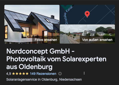 Bei unserer Recherche sind wir auf die Firma Nordconcept aus Oldenburg gestoßen. Mit 4,9 Sternen Durchschnittsbewertung auf Google gehört Nordconcept zu den am besten bewerteten Solarfirmen Deutschlands. Sie hat sich auf Solarlösungen für den Norden spezialisiert und wirbt mit autarker Energieversorgung.