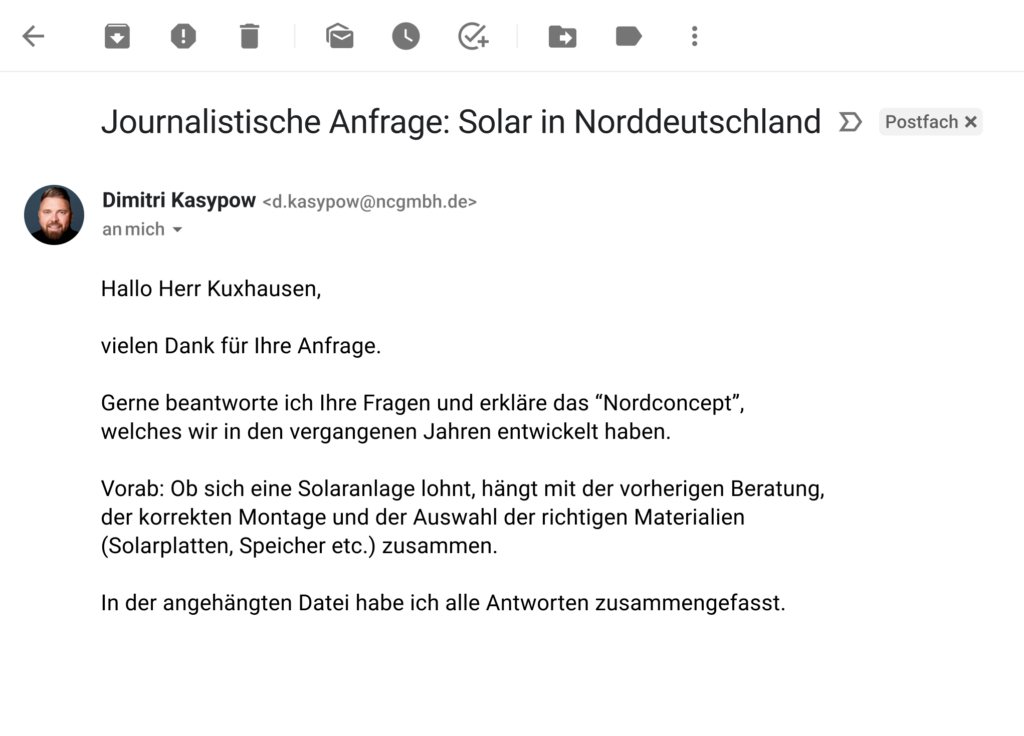 Bei unserer Recherche sind wir auf die Firma Nordconcept aus Oldenburg gestoßen. Mit 4,9 Sternen Durchschnittsbewertung auf Google gehört Nordconcept zu den am besten bewerteten Solarfirmen Deutschlands. Sie hat sich auf Solarlösungen für den Norden spezialisiert und wirbt mit autarker Energieversorgung. Doch was genau soll das bedeuten? Unsere Redaktion stellt eine Anfrage per Mail.